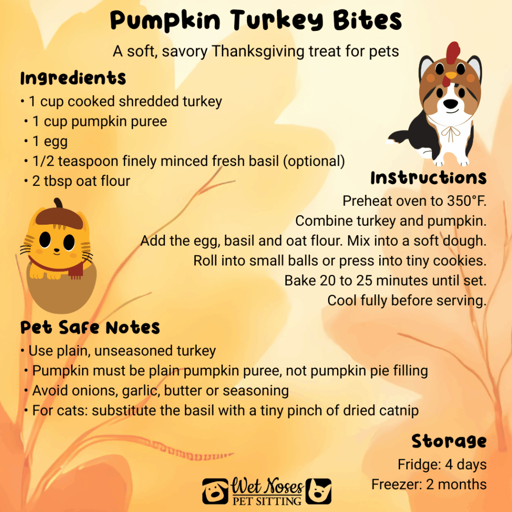 If you still want your pet to feel included in the festivities, you can offer them a homemade treat made with simple, pet friendly ingredients. It gives them the fun of a holiday reward without any of the risks that come with cooked bones. Give our soft, savory Pumpkin Turkey Bites a try.